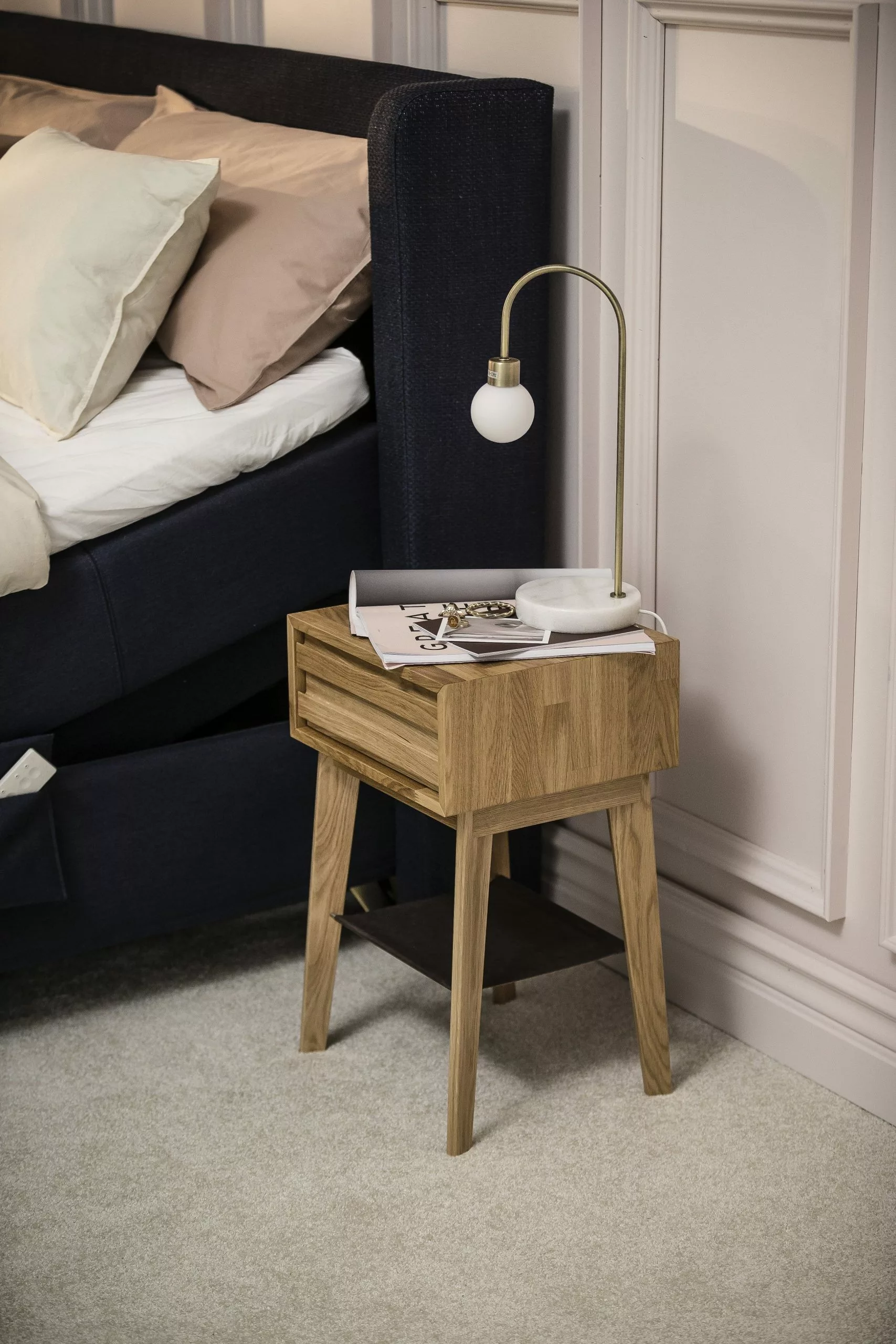 Nattbord i massivt trä. Finns i 3 olika utföranden: ek, vitlaserad och svart. Spännande skinndetaljer och praktiskt invändigt fäste för laddningskabel. Mått: B39 x D34,8 cm.