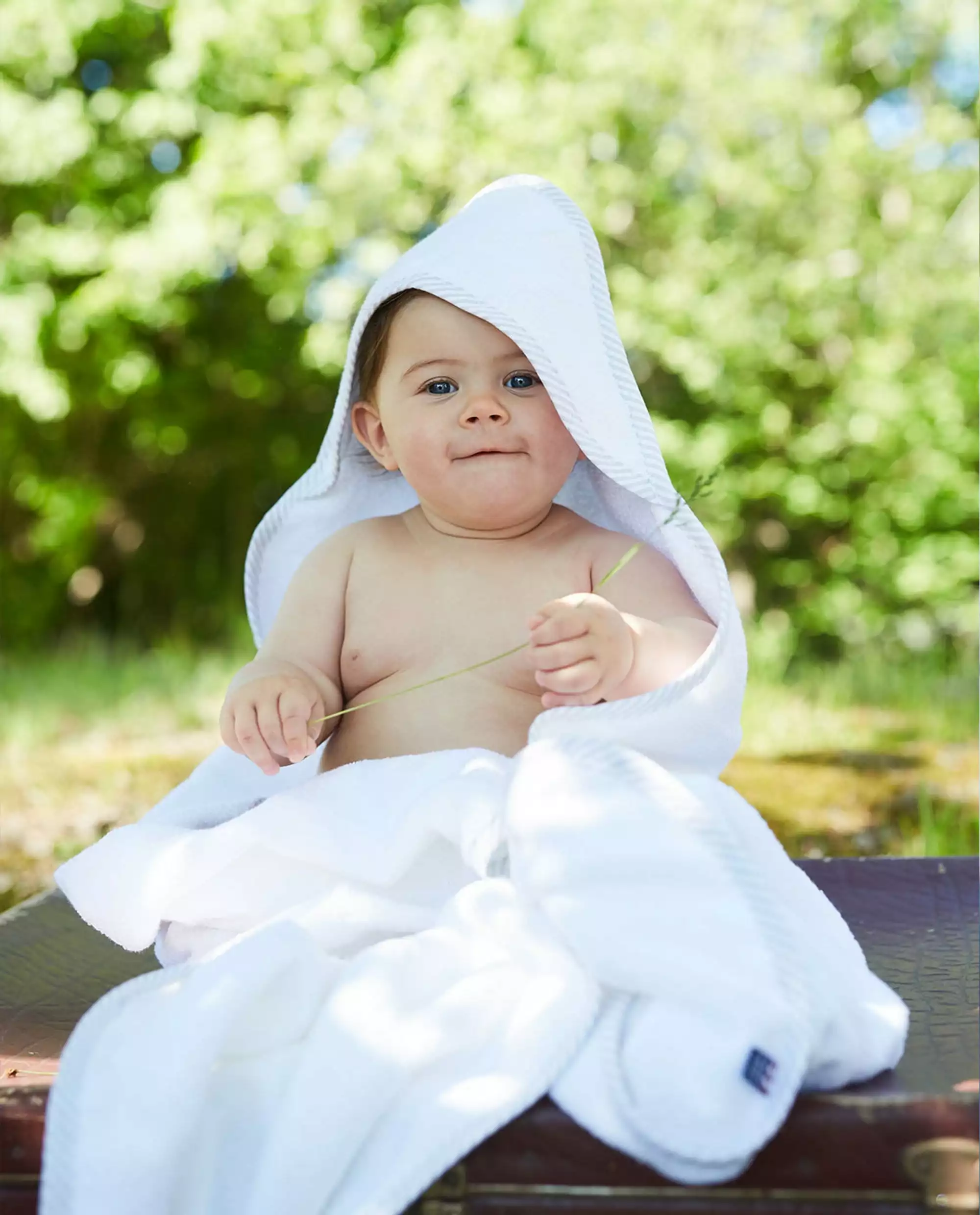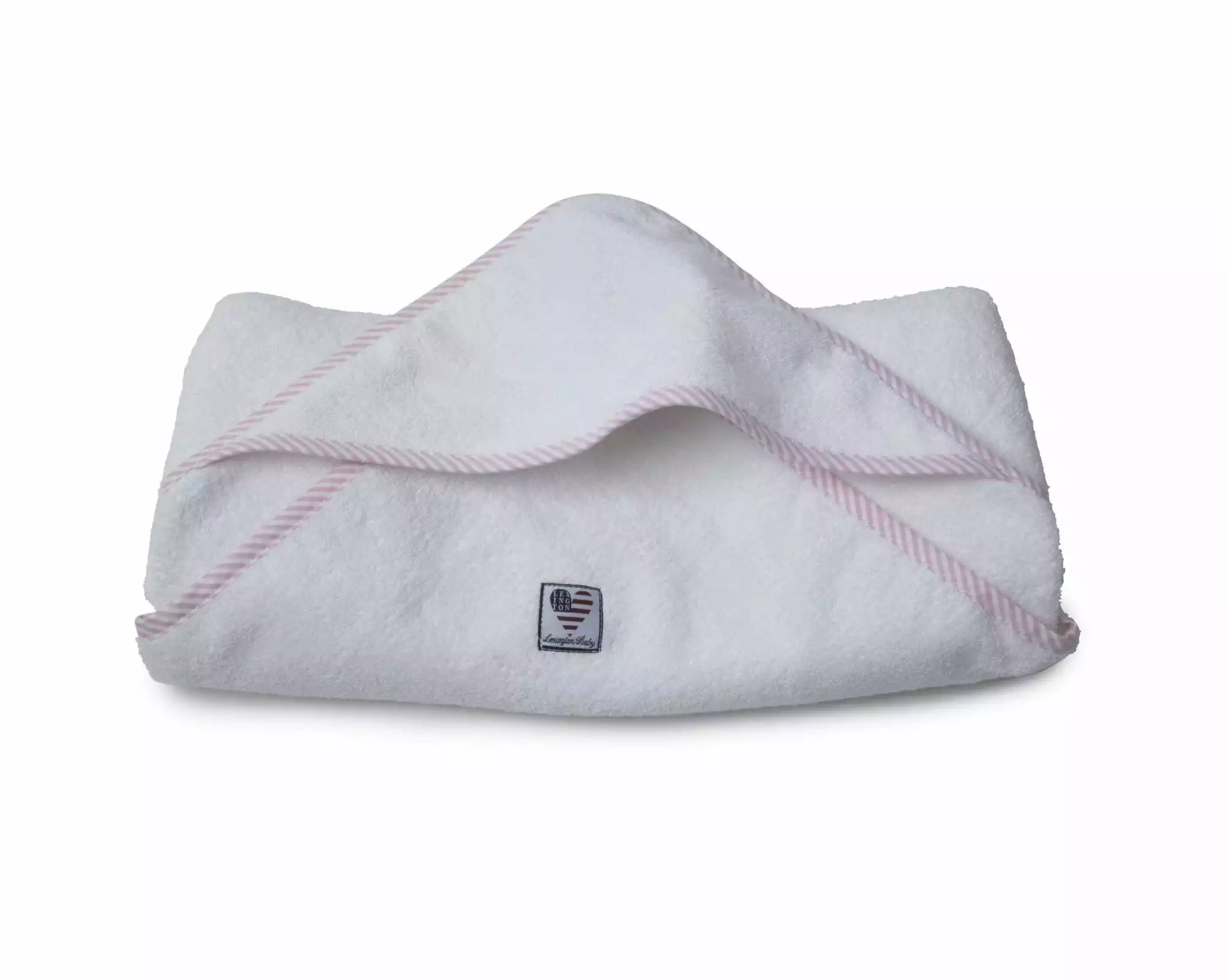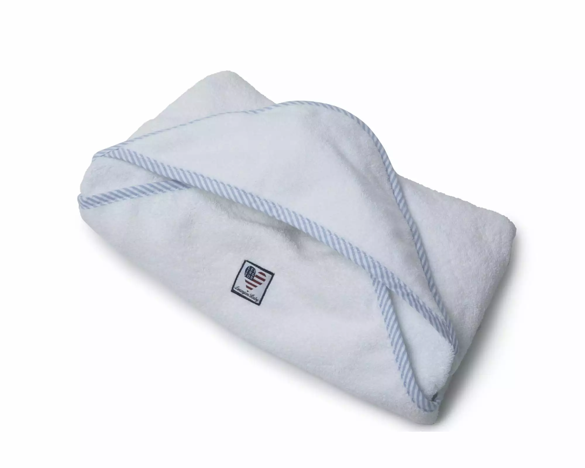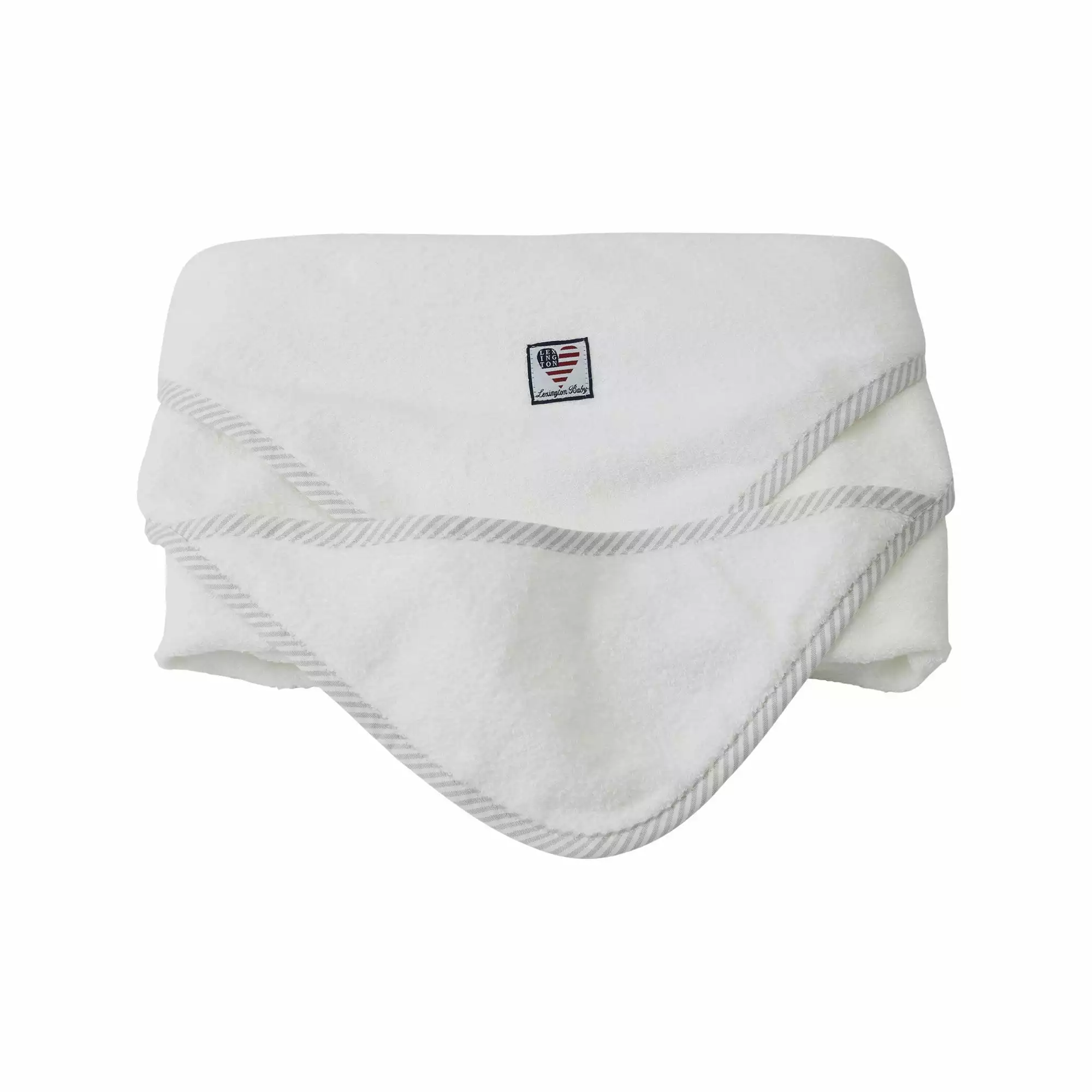 Lexingtons badcape för babyn tillverkad i 100 % bomullsfrotté med praktisk huva. Kantad med randvävda band i oxfordbomull.